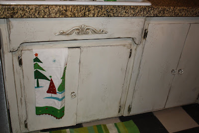 I had to give this area a little something so I took some wood glue and slapped this lovely on and with a little distressing it looks like it is an original piece. And isn't that the cutest dish towel EVER? It was a gift from my dear friend!!!